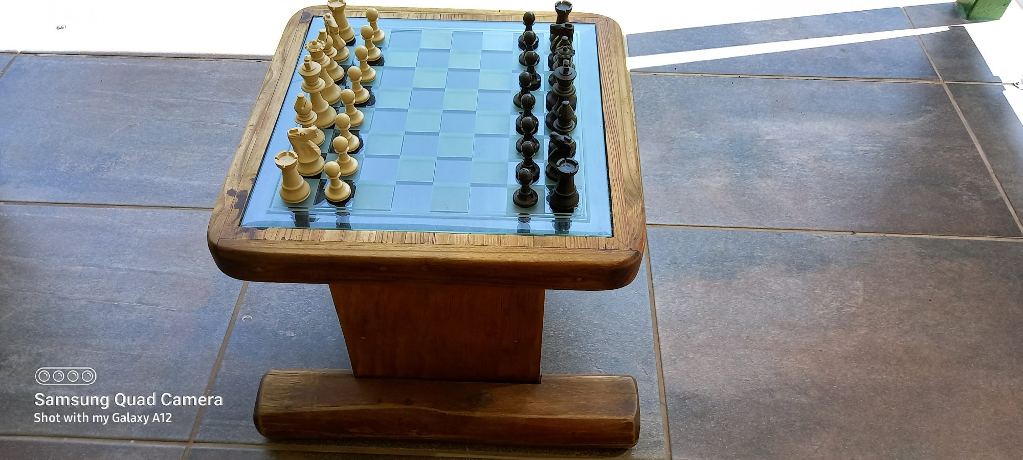 The Staunton Commercial Club Chess Set is a popular competition chess set that can be found in many stores. When playing traditional chess games with my family, we always opt for this particular Staunton Style chess set. The glass board used for our games was originally part of a chess set gifted to me by a dear friend, and you can find more pictures of it below. My late father counter-sunk the glass board into a portable wooden table that I had purchased from a second-hand furniture store.